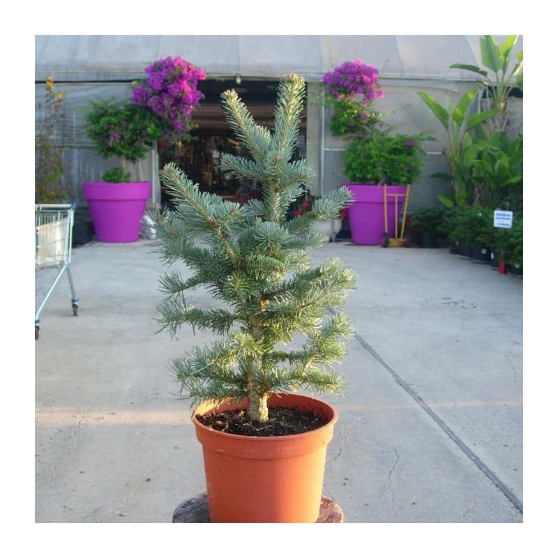 Abeto piramidal de hojas de color verde gris pálido, y crecimiento muy lento.