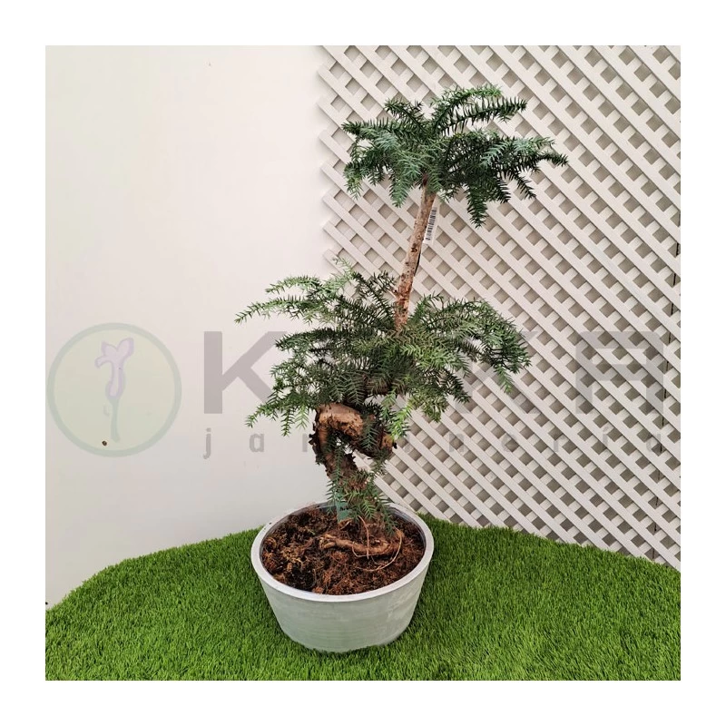 Araucaria cunninghamii es uno de los mejores bonsái, se puede utilizar tanto para interior como exterior en climas que no hayan grandes heladas. Sus hojas son de un color verde azulado.
